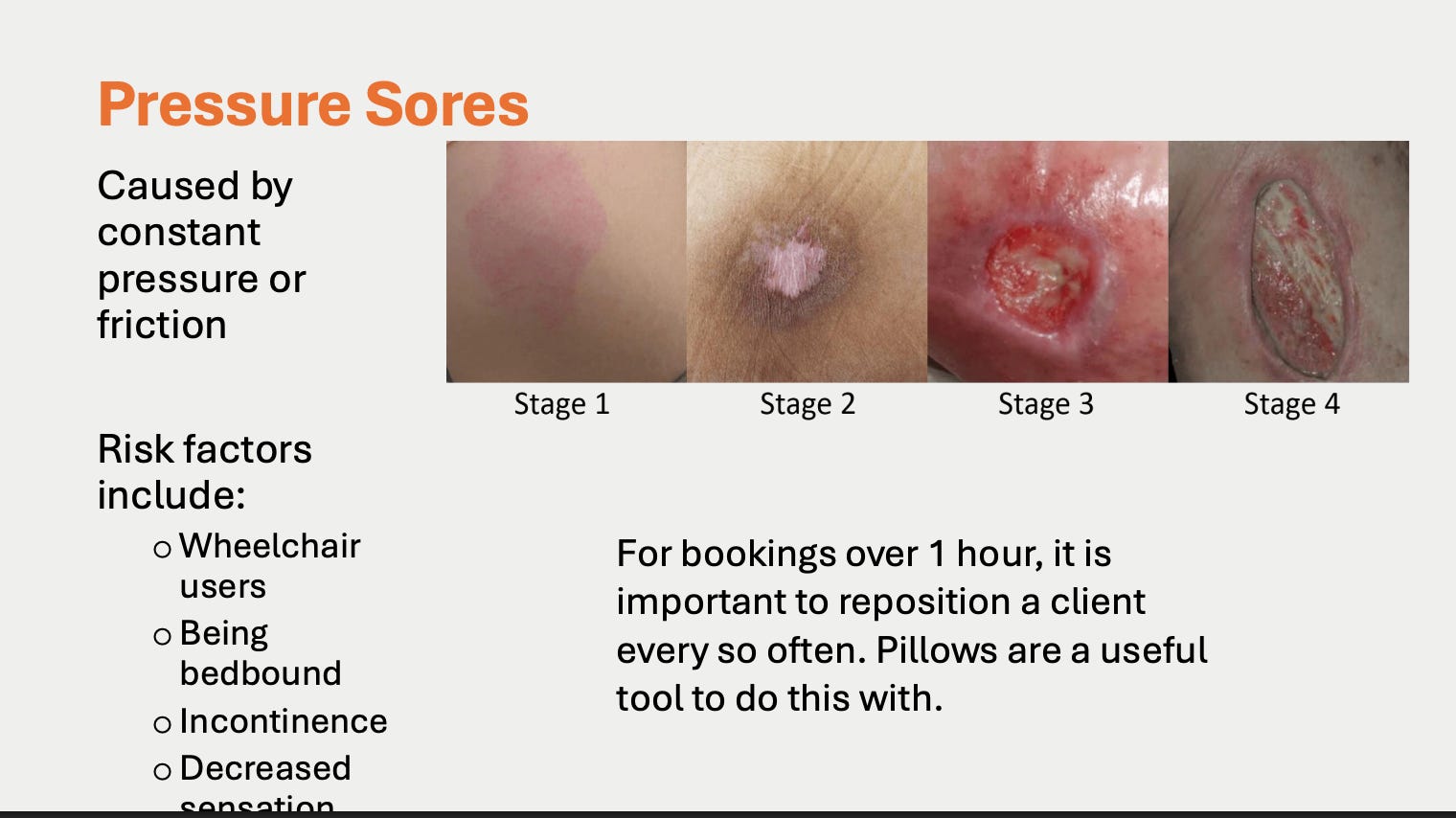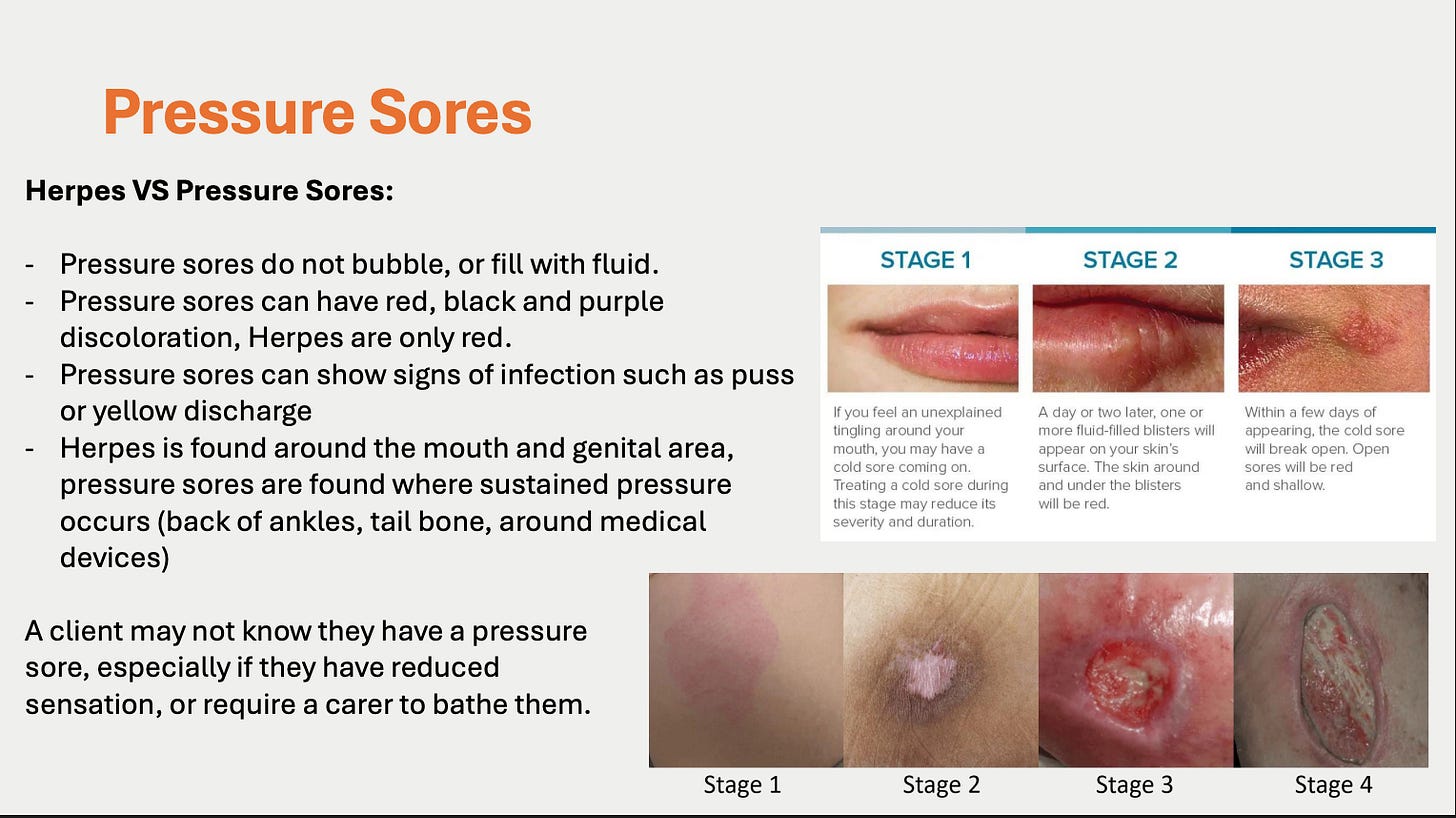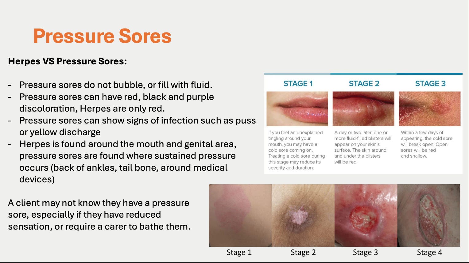 A client may not know they have a pressure sore, especially if they have reduced sensation or require a carer to bathe them,