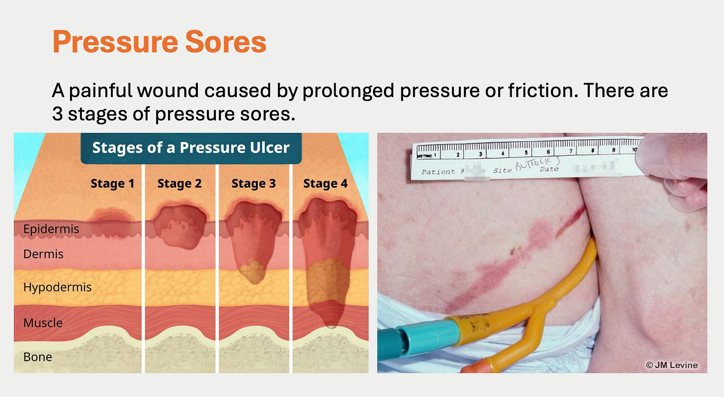 A pressure sore is a painful wound caused by prolonged pressure or friction. There are 3 stages of pressure sores, as seen below.