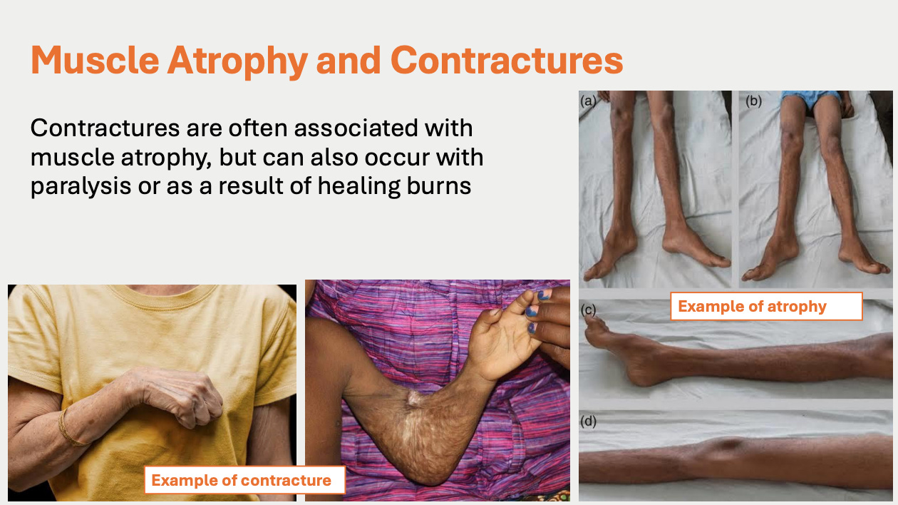 Contractures are often associated with muscle atrophy, but can also occur with paralysis or as a result of healing burns.