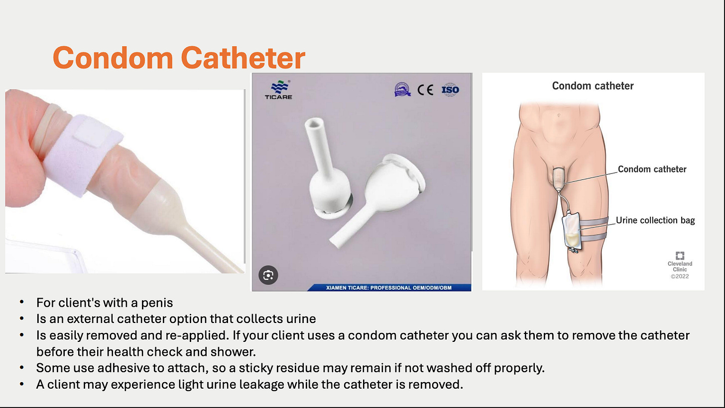 Is easily removed and re-applied. If your client uses a condom catheter you can ask them to remove the catheter before their health check and shower.