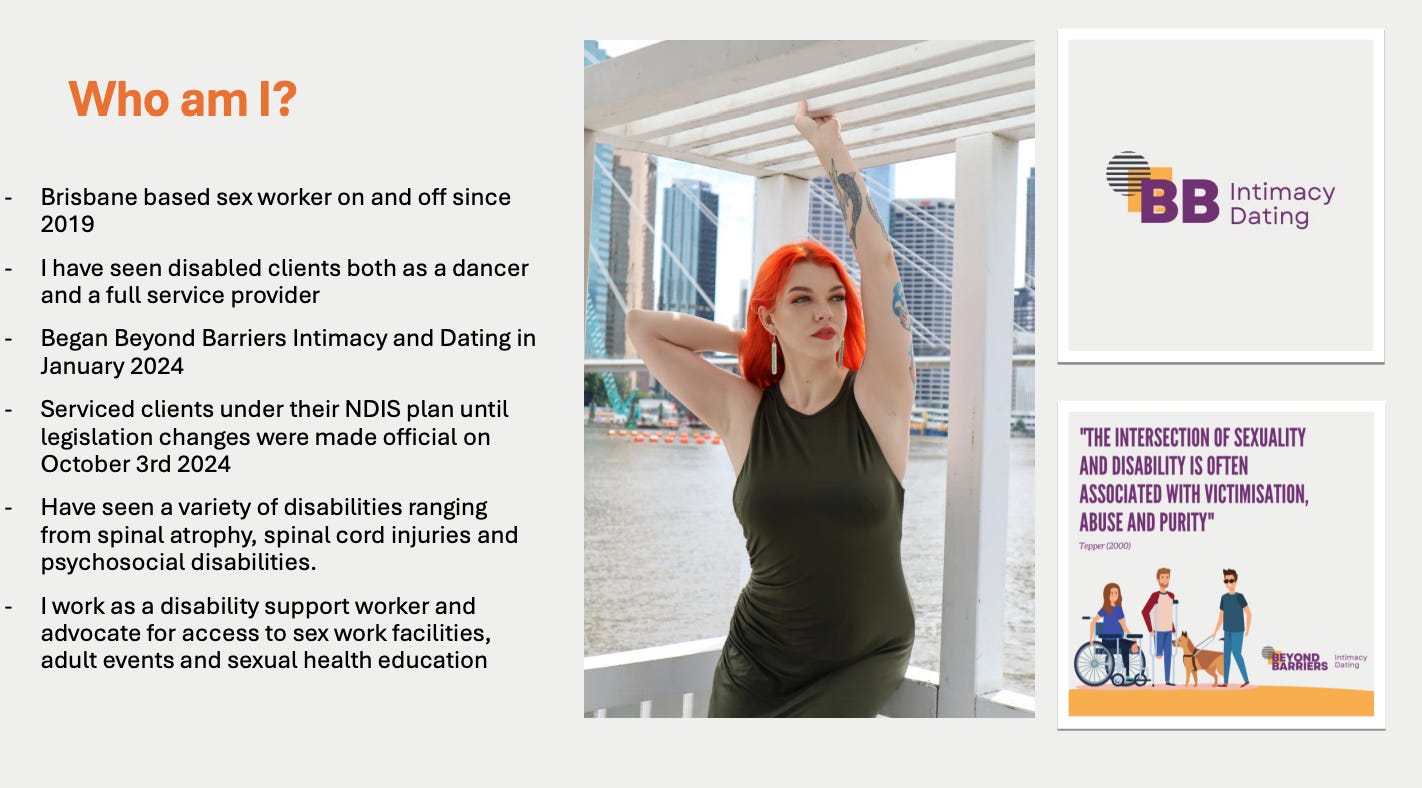 Avalon is a Brisbane based sex worker and disability advocate with a background in support work and allied health. Avalon opened Beyond Barriers Intimacy and Dating in January 2024, and provided necessary and reasonable supports to NDIS participants. She has worked with multidisciplinary teams to provide safe and satisfying intimacy to a wide range of high physical needs clients.