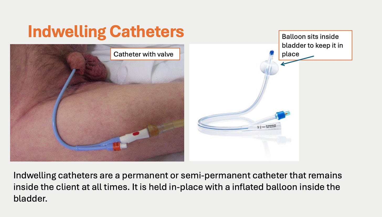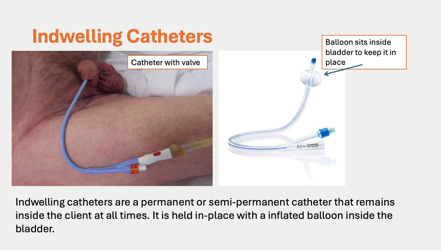 Indwelling catheters are a permanent or semi-permanent catheter that remains inside the client at all times. It is held in place with an inflated balloon inside the bladder.