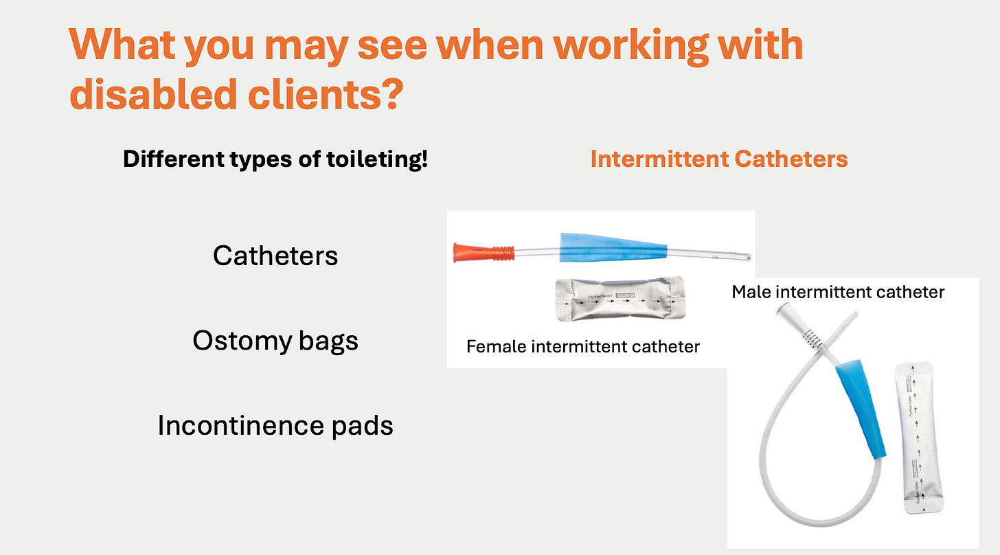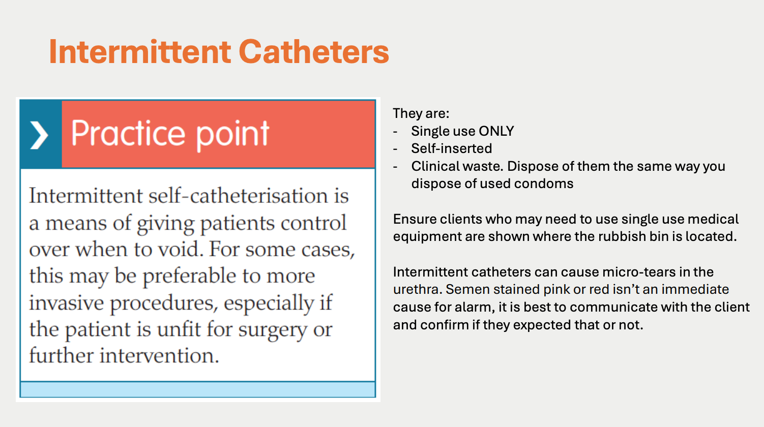 Ensure clients who may need to use single medical equipment are shown where the rubbish bin is located. Intermittent catheters can cause micro-tears in the urethra. Semen stained pink or red isn’t an immediate cause for alarm, it is best to communicate with the client and confirm if they expected that or not.